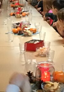 Warten auf das Christkind ✨ Am Donnerstag, den18.12. war es dann endlich so weit: Wir warteten auf das Christkind. Die Aufregung war kaum zu übersehen! Vor der Turnhalle fand sich Glitzerstaub – ein klares Zeichen, dass das Christkind da gewesen war. Unter dem Christbaum lagen Geschenke für die Kinder bereit. Zuvor konnten sich alle Kinder an der langen Tafel im Flur stärken und gemeinsam die besondere Atmosphäre genießen.