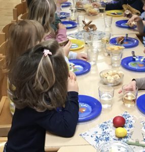 Am Tag der Feier erwartete die Kinder eine liebevoll gedeckte und festlich geschmückte Tafel im Flur, an der wir am Vormittag ein köstliches Osterfrühstück genossen.